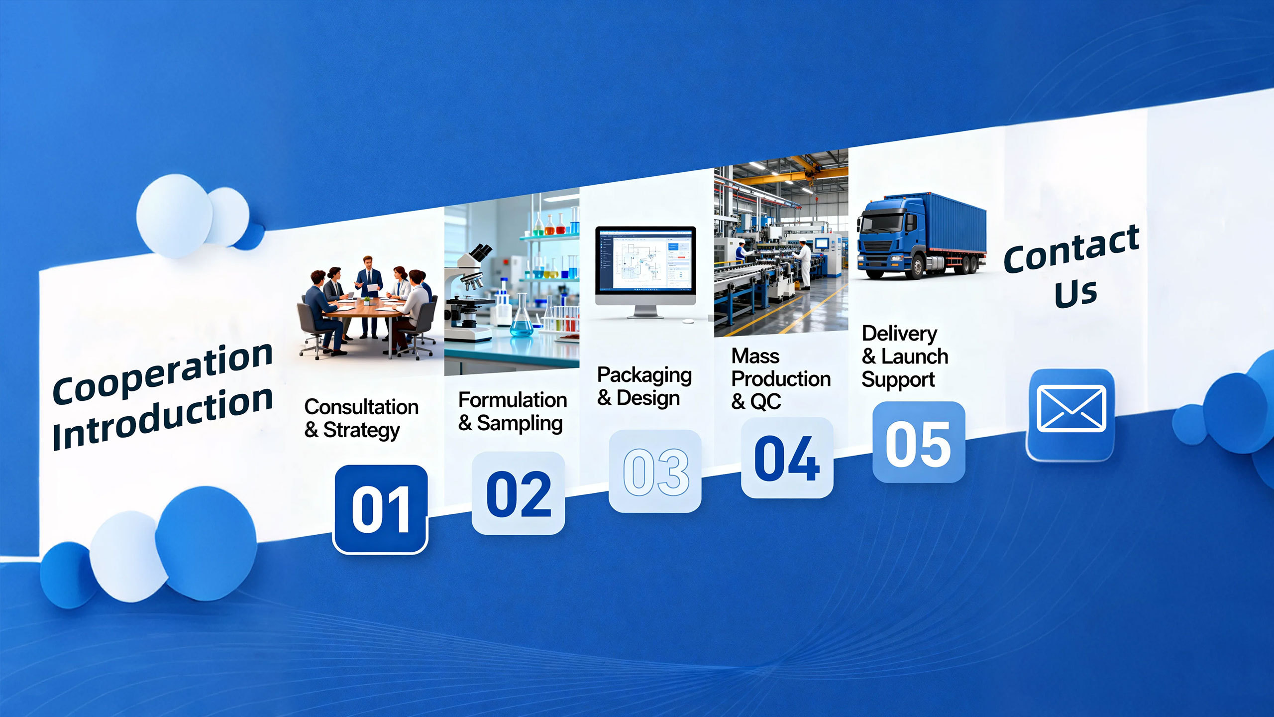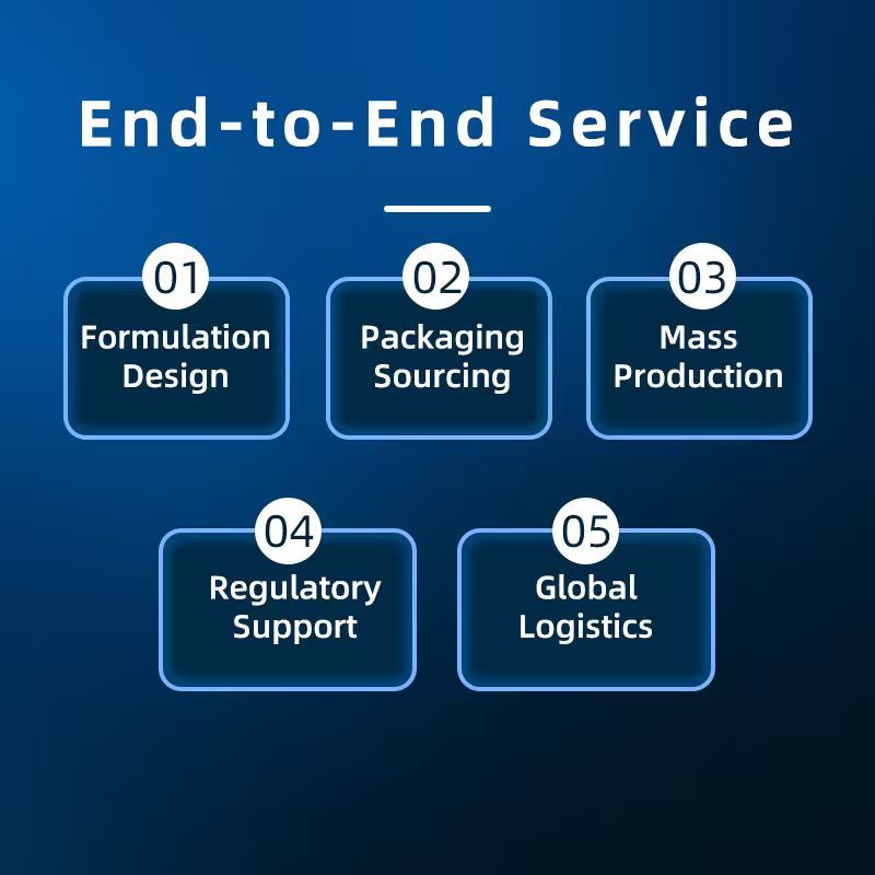 From formulation design and packaging sourcing to mass production, regulatory support, and global logistics, we offer a seamless end-to-end service, allowing you to focus on brand marketing